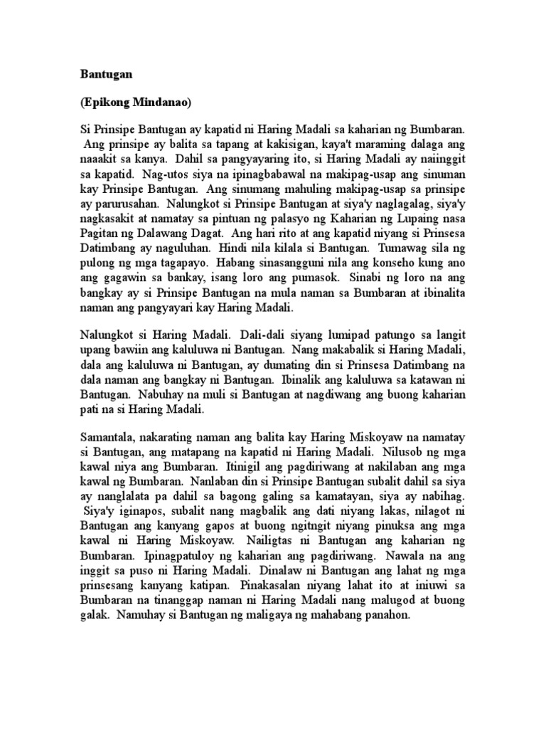 Bantugan Epiko ng Mindanao Isa sa mga halimbawa ng epiko ng Pilipinas ang Bantugan na epiko ng Mindanao. Buod ng epikong bantugan tagalog lang.