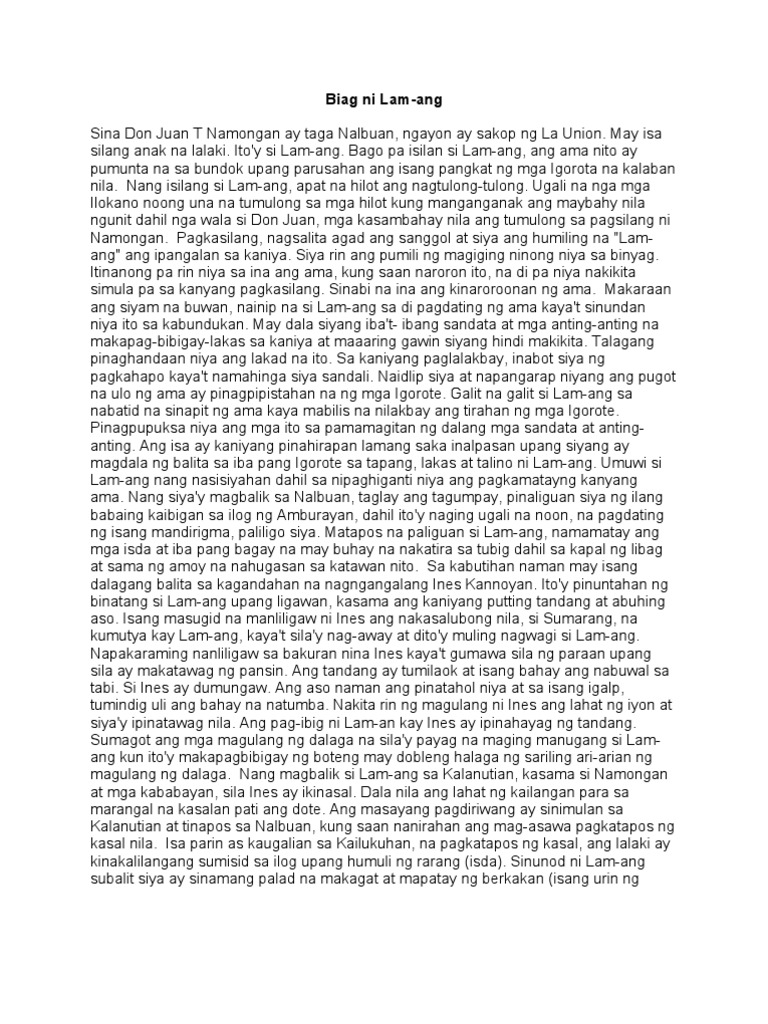 Consfadic Si biuag at malana epiko ng cagayan ang buong kwento Ano ang buong kwento ng Biag ni Lam- ang. Ang Buhay Ni Lam-Ang Siyam na buwan bago siya isinilang sa isang maharlikang familia namundok ang kanyang ama upang sugpuin ang isang masamang pangkat ng mga Igorot. The Ibalon relates the mystical origins of the first man and the first woman of Aslon and Ibalon which are current provinces of Camarines Albay Sorsogon Catanduanes.