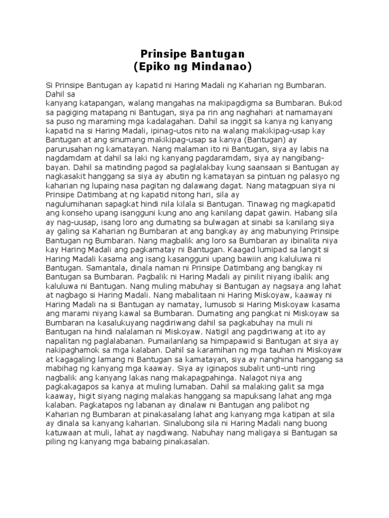 Ipinagbawal niya sa kanyang mga nasasakupan na kausapin si Prinsipe Bantugan. Epiko ni prinsipe bantugan buong kwento. Prinsipe BantuganEpiko ng MindanaoSi Prinsipe Bantugan ay kapatid ni Haring Madali ng Kaharian ng Bumbaran.